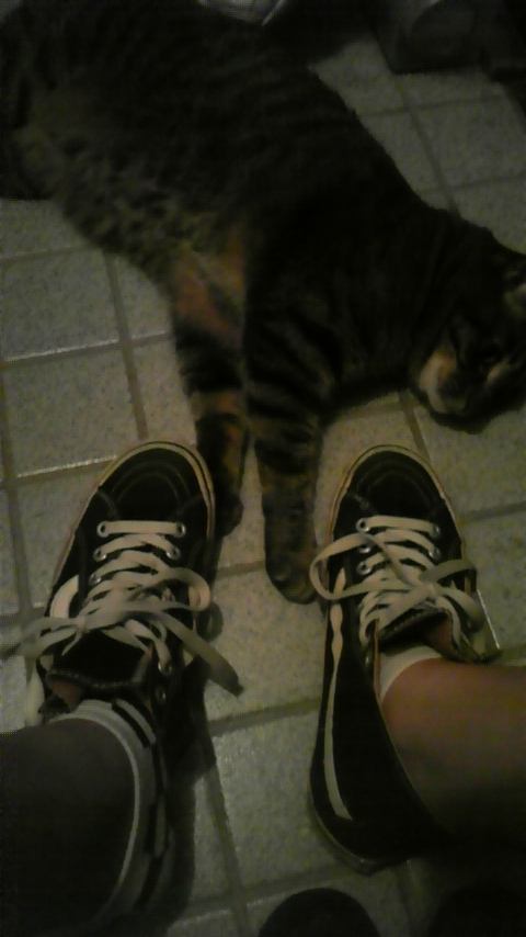 VANS黒ハイ・カット(以前クロマニヨンズの「歩くチブ」でモッシュにもまれているとき片方が脱げてそのまま行方不明になり片足のまま一夜を明かしたが翌日迷子センターもとい落し物置き場の山の中で奇跡の再会を果たしたといういわく付きの靴なのだ)